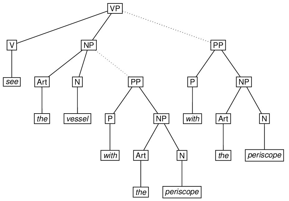 Ambiguity involving alternative tree structures associated with the same terminal sequence can be encoded relatively conveniently using a combination of the exclude and copyOf attributes described in sections 16.8 Alternation and 16.6 Identical Elements and Virtual Copies. In the simplest case, an eTree may be part of the content of exactly one of two different eTree elements. To mark it up, the embedded eTree may be fully specified within one of the embedding eTree elements to which it may belong, and a virtual copy, specified by the copyOf attribute, may appear on the other. In addition, each of the embedded elements in question is specified as excluding the other, using the exclude attribute. To illustrate, consider the English phrase see the vessel with the periscope, which may be considered to be structurally ambiguous, depending on whether the phrase with the periscope is a modifier of the phrase the vessel or a modifier of the phrase see the vessel. This ambiguity is indicated in the sketch of the ambiguous tree by means of the dotted-line arcs. The markup using the copyOf and exclude attributes follows the sketch.