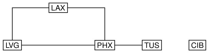 Here is an example of an undirected, cyclic disconnected graph, in which the nodes are annotated with three-letter codes for airports, and the arcs connecting the nodes are represented by horizontal and vertical lines, with 90 degree bends used simply to avoid having to draw diagonal lines.
