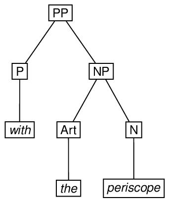 Depending on the grammar one uses to associate structures with examples like see the man with the periscope, the representations may be more complicated than this. For example, adopting a version of the X-bar theory of phrase structure originated by Jackendoff,73 the attachment of a modifier may require the creation of an intermediate node which is not required when the attachment is not made, as shown in the following diagram. A possible encoding of this ambiguous structure immediately follows the diagram.